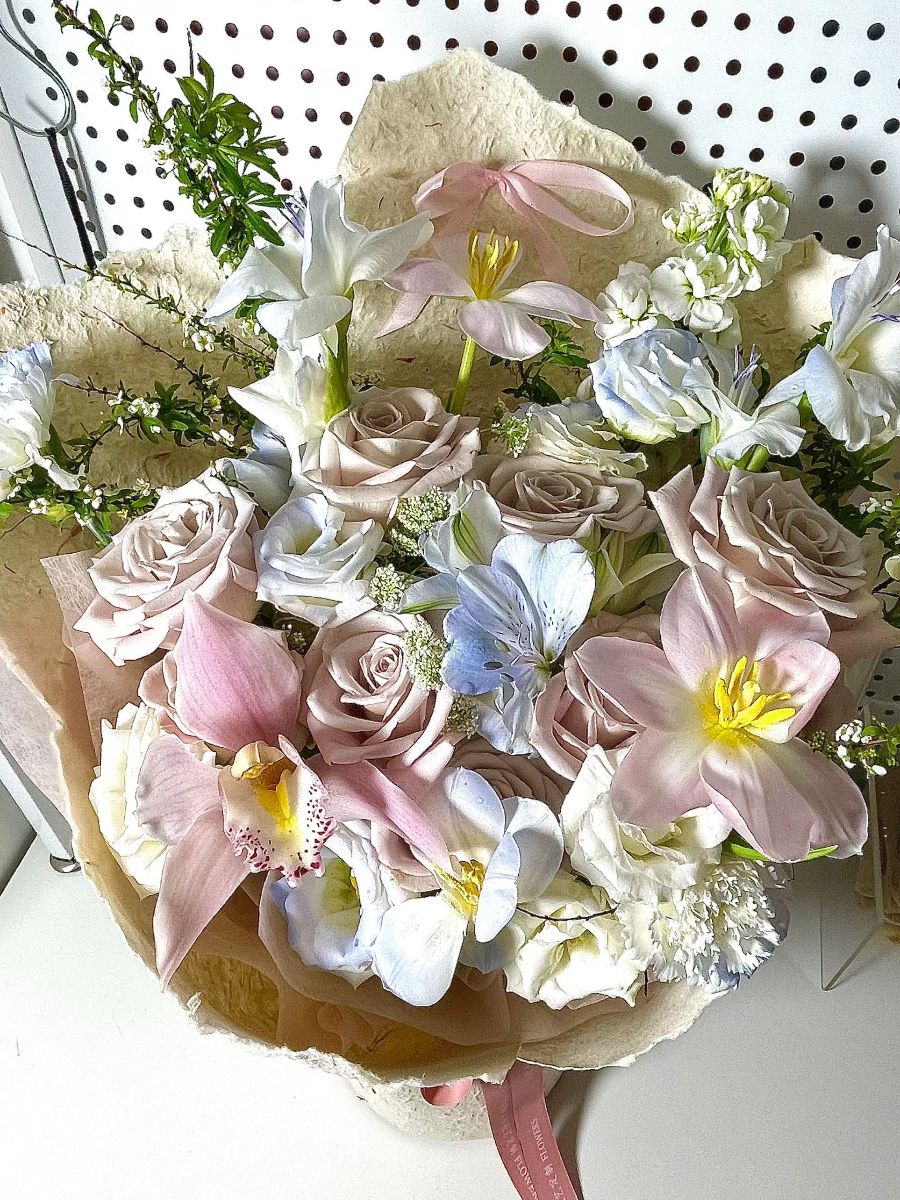 这束花是温柔本身的具象化,粉与白的主调揉合出软糯的氛围感。浅粉色的玫瑰层层叠叠,花瓣带着细腻的绒感,像是晕开的腮红;粉白色的蝴蝶兰舒展着花瓣,花芯的黄纹添了几分灵动,与淡蓝色绣球花交织在一起,冷调的蓝中和了粉色的甜腻,让整体层次更丰富。几枝嫩绿的配草穿插其间,给柔和的花束注入了鲜活的生机,米白色的包装纸随意包裹着花材,没有刻意的规整,反倒凸显了自然的美感。每一朵花的姿态都舒展自然,像是春日里揉碎的温柔风,捧在手里,仿佛接住了一整个浪漫的春日,既适合赠予他人传递心意,也适合摆在桌前,让日常多一