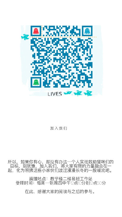 而在我们学校就有几只小流浪猫的存在。就此,我们小组将会从现在开始进行以个人为单位的募集,也希望能够在校园里找到愿意加入我们的同学,能够为了这些可爱又可怜的小家伙们,一起出一份力。