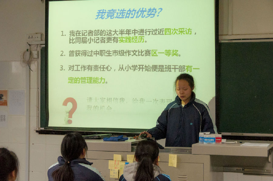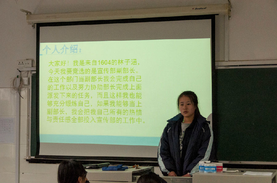 竞选以个人演讲的形式进行,每位候选人参照自己精美的PPT对自己的竞选作简短介绍和陈述。每一位参加竞选的同学,都充分的表现了自己,表述了自己竞选的职务及自身存在的优势,对未来工作进行了展望。