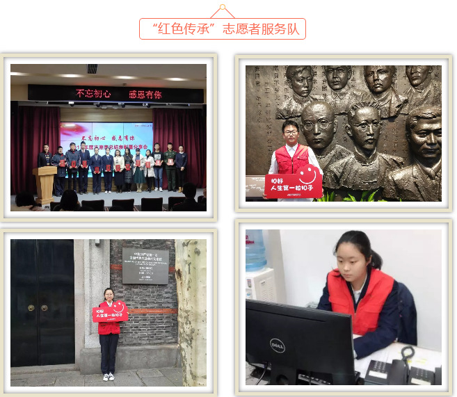 “红色传承”志愿者服务队,由我校党员教师及学生团员、入团积极分子组成。以党员带领团员的形式,发挥我校各专业技能优势,为中国共产党第一次全国代表大会会址提供引导接待及电话咨询等特色志愿者服务。