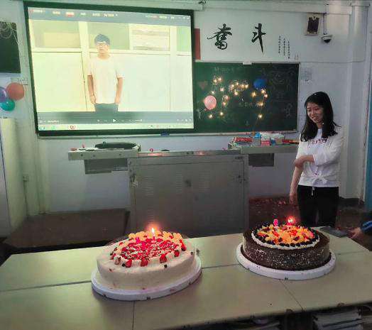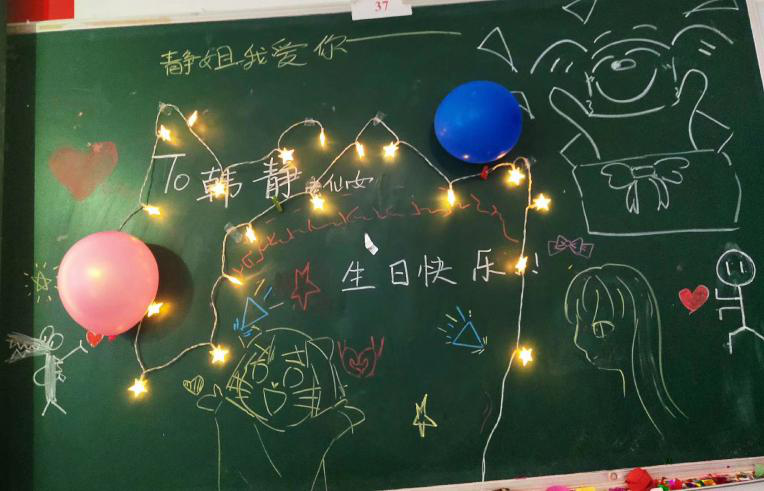 2019529日,1802全体同学为班主任韩静老师庆生。此过程韩静老师完全不知情。最终在上午10:20分之际,在韩静老师踏入1802门口的那一刻,礼炮在那一刻响起,眼前五颜六色的气球展现在韩静老师的眼前,漆黑教室下的星星灯显得格外有氛围。一阵欢呼过后,渐渐地响起了生日歌的声音,全班同学一起为韩老师唱起了生日歌...投影仪上播放着大家一起为韩老师说下的生日祝福以及感恩韩老师一直以来对1802班付出的一切心血。