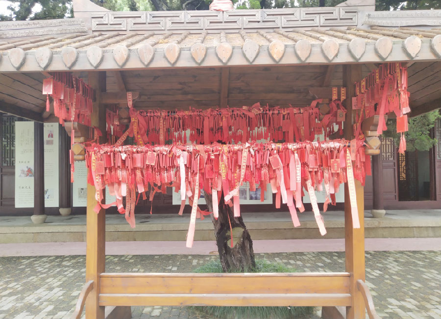 学宫的许愿亭深受同学们的喜欢,他们纷纷购买许愿带或许愿牌,写上祝愿的话语并挂在许愿亭的高处,相传挂的越高愿望越容易达成。挂好后,学生们对着自己面前的牌子许愿,希望自己许下的愿望能尽快达成。
