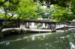 拙政园,位于江苏省苏州市东北隅。全园以水为中心,山水萦绕,厅榭精美,花木繁茂,具有浓郁的江南水乡特色。花园分为东、中、西三部分,东花园开阔疏朗,中花园是全园精华所在,西花园建筑精美,各具特色。园南为住宅区,体现典型江南地区传统民居多进的格局。而拙政园主要以水为主体,庭院和绿树都在水流两旁。
