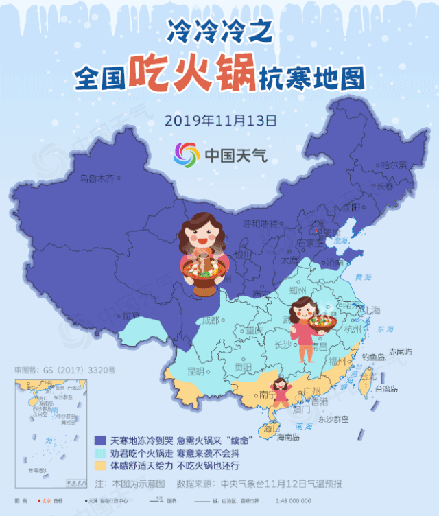 在吃货眼里,世界万物皆可涮!近日最强冷空气“倾巢南下”,多地气温遭“腰斩”,全国吃火锅抗寒地图应运而生,告诉你哪里将冷到瑟瑟发抖急需火锅“续命”。