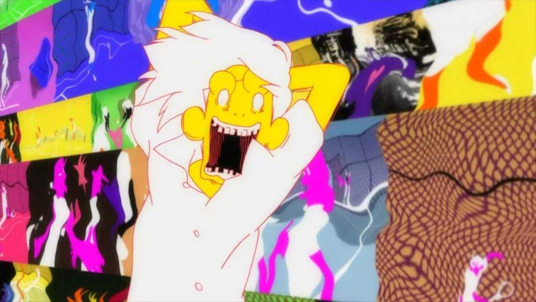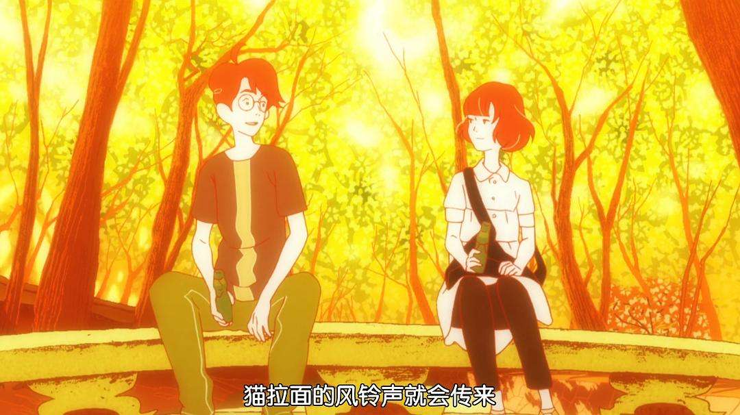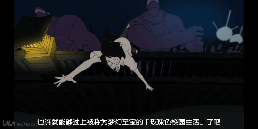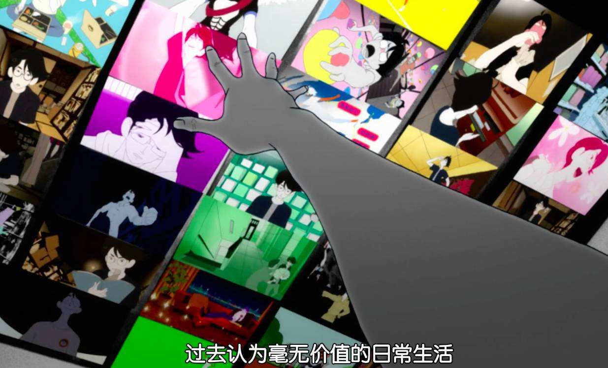 这里不得不提到本作最大的亮点裸奔的一场戏。“我”在承认当下的自己后,冲破了四叠半的壁垒,一路朝着小津的方向狂奔,胡子、长发、衣服都在不断切换的“平行世界”的回忆中撕成碎片。“我”如初生的婴孩一般站在桥头拥抱小津(小津隐喻世俗化的生活)。