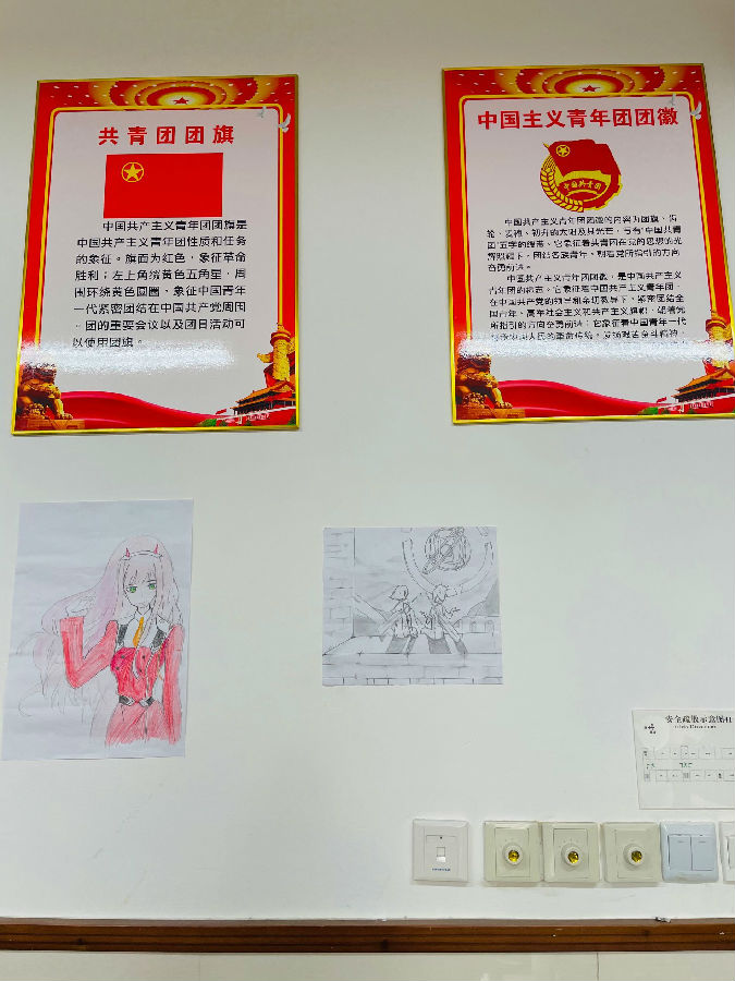 团支部书记—朱弈林同学将共青团团旗与中国主义青年团团旗的介绍挂在墙上,给同学们科普知识。