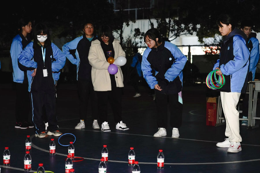 庚子岁末,严冬已至,盼望已久的冬日活动终于到来。活动当天,以主席台为中心,从右到左依次在跑道上布置了5个活动摊位,各摊位被装饰上了点点星灯,暖光在夜里显得尤为明显。4个小游戏中,当属“中心小舞台”最为火爆,从游戏开始时便排起了长长的队伍,红毯上设有音响设备,黑夜中的星星彩灯与红毯相交辉映。同学们可以走上属于自己的表演舞台,展现个人的魅力与风采。