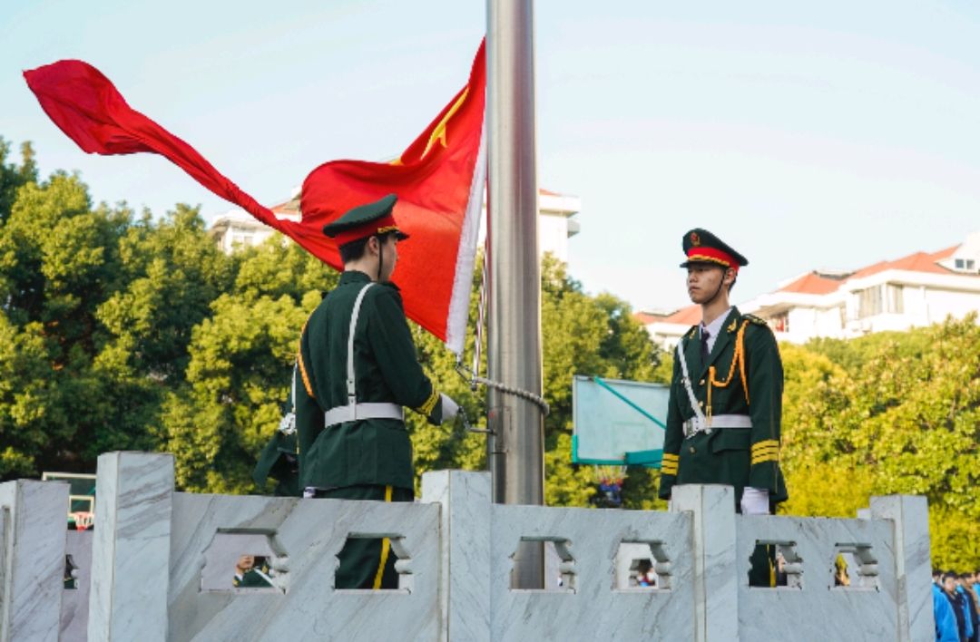 早晨八点整,升旗仪式准时开始。我校国旗仪仗队的成员们穿着挺拔,英姿飒爽地走向领操台。旗手和护旗手走上领操台,绑旗、扬旗。一声“升国旗,奏国歌”后,全场同学肃穆,行注目礼。