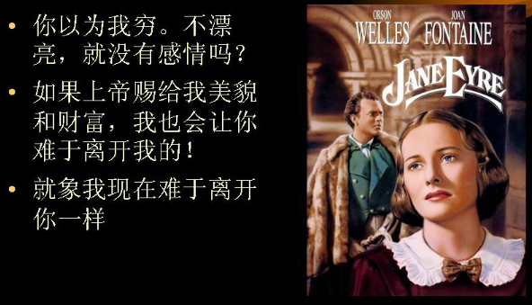 书中让我印象最为深刻的,是简爱的反抗精神。被惯坏的表哥总是欺负年幼的简爱,他甚至把她当仆人一样使唤,而她却能不畏强暴,怒斥这个迫害她的坏家伙:“你这个男孩真是恶毒又残酷!你像个杀人犯!你像个虐待奴隶的人!你像罗马的皇帝!”接着和她表哥扭打起来,结果当然是简爱吃了亏,被关进屋子。接下来她反抗的对象是以恩人自居的冷酷无情的舅妈,里德太太。当里德太太认为凭借她在家里的地位可以吓到她的外甥女时,简爱却一针见血的骂她:“别人以为你是个好女人,可是你坏,你狠心。”而这时里德太太居然也觉得害怕了。