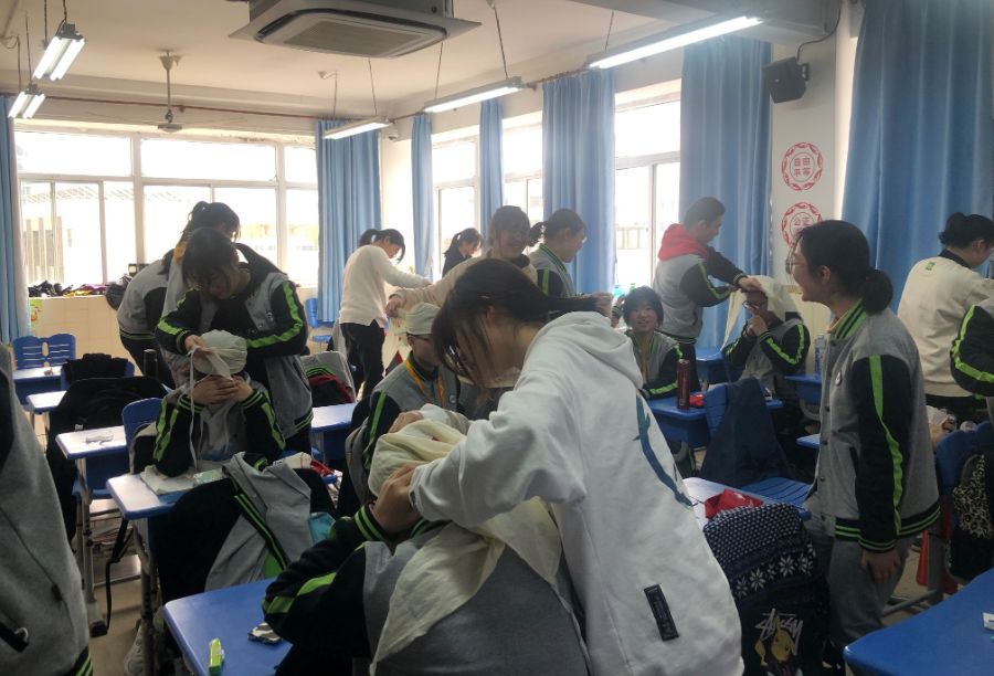 军训第二天的上午由教官在室内为我们讲解了救护与包扎的知识,并且让我们也实际操作体验了包扎这项技能。在为同学包扎的时候,同学好像就是受了伤的伤员正等待着大家的救助,于是便有模有样地认真学习,用心练习起来。