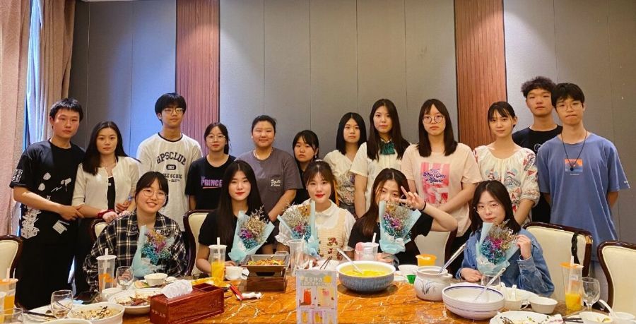 享用完佳肴过后,为学姐们密谋已久的一场惊喜也悄然而至。有几个同学悄悄离开了包间,还有的同学跳起舞搞怪起来转移学姐的注意力,也有的同学偷偷站起来拿起手机准备记录下特别的一刻。不一会儿大家捧着五束清新淡雅的花进来,将它们一一送给五位美丽的学姐。学姐们都露出了欣喜的笑容。