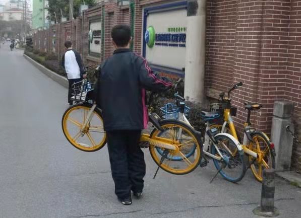 张渠老师带头先行做示范,将一辆随意停放在路边的共享单车调整车头方向,推到停车位。紧接着学生志愿者一个接一个地上前,卖力地把校门口附近的单车扛到指定位置。他们不叫苦不叫累,中途有十分细心的学生,将沿河距离学校两百米远的单车搬到停车位后,把所有的单车座椅调整到统一高度。最后,经过张渠老师和学生志愿者半个多小时的努力,一排排井然有序的共享单车停放在学校门口,创建出文明有序的公共环境。
