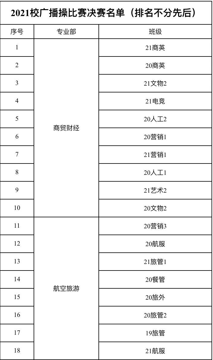 为丰富校园文化生活,提高学生们的身体素质,培养同学们团结协作奋发向上的精神风貌,增强集体荣誉感。10月18日我校商贸财经专业部和航空旅游专业部分别在贵州路101号和浦东南路1548号操场上组织了全校广播操比赛初赛。