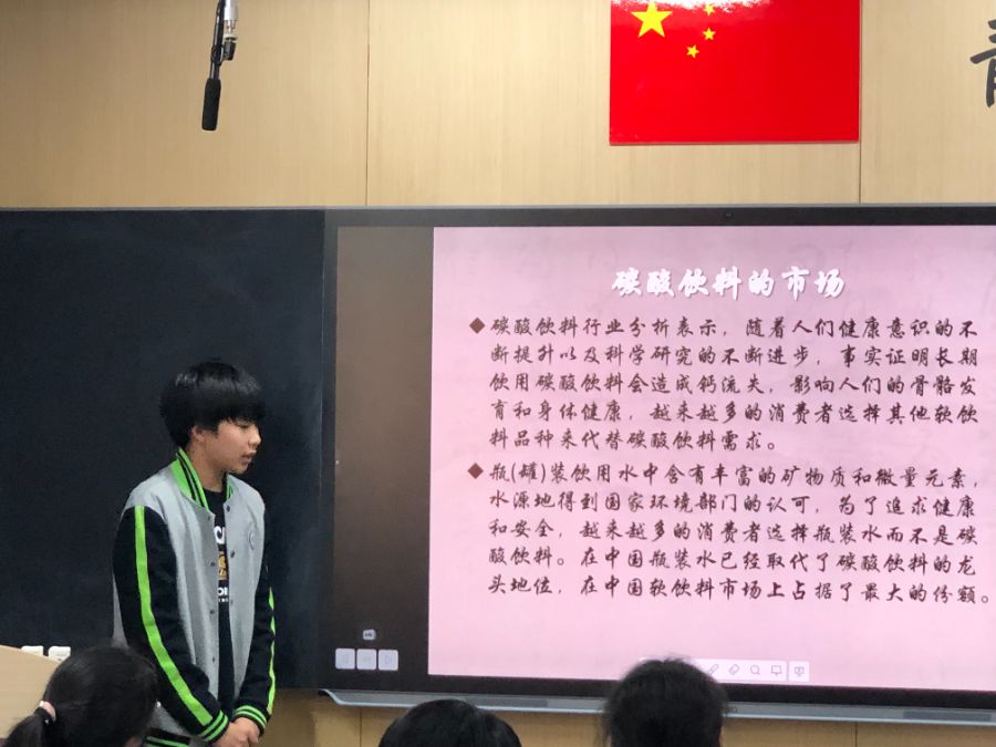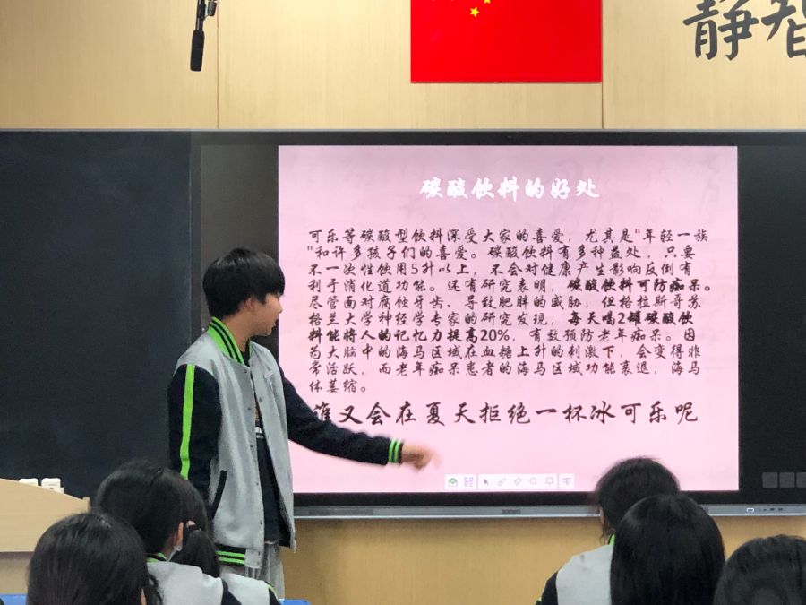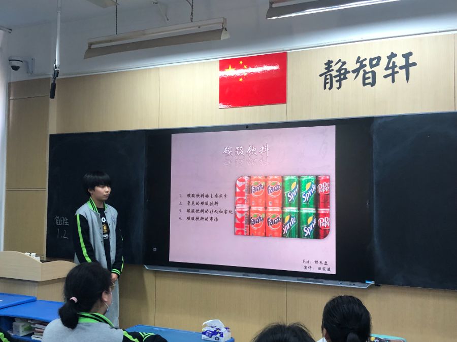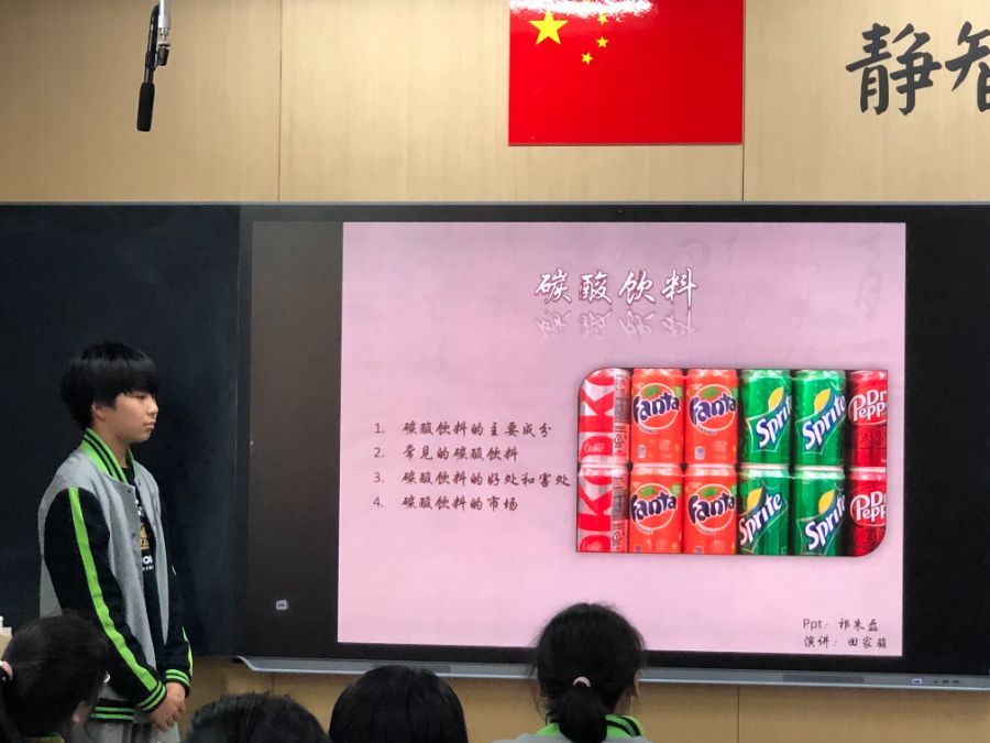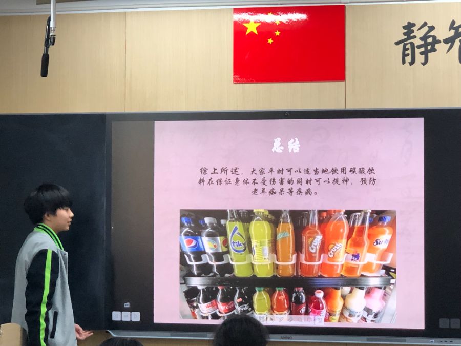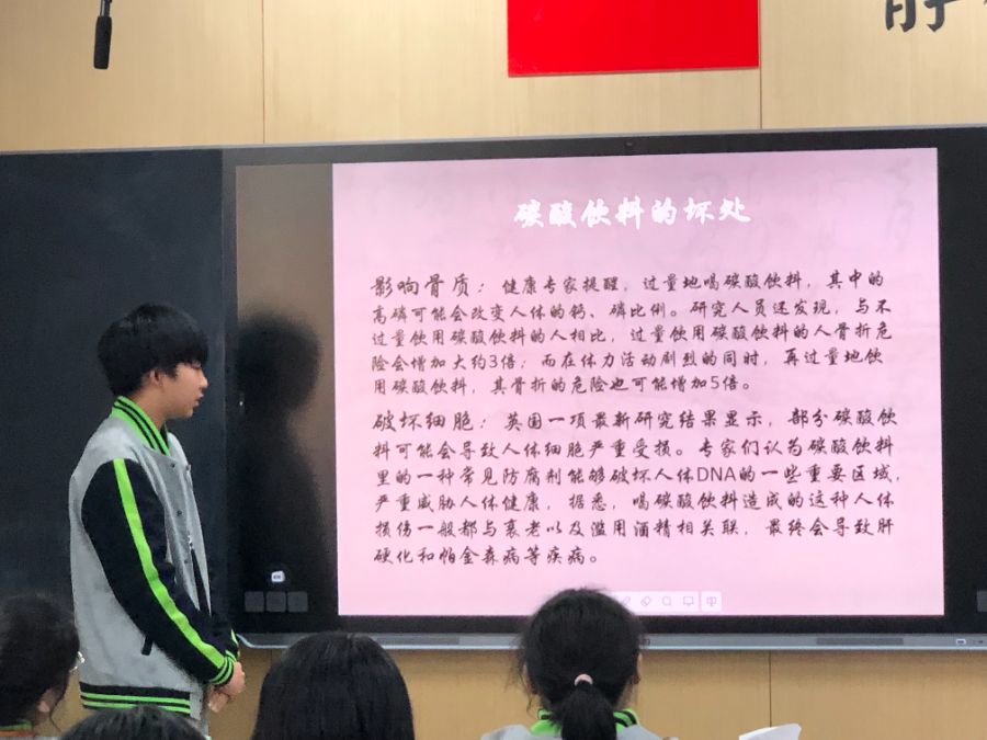 0552102班的田家骏同学在班会课上给我讲解了碳酸饮料的市场,好处以及坏处 ,并给同学们观看了相关视频,让同学们充分了解了常喝可乐带给我们身体的影响,但同时同学们也知道了适当喝可乐可以提高记忆力,预防老年痴呆等作用。