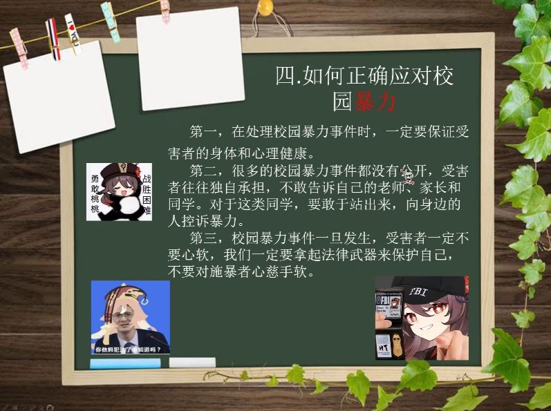 此次线上班会主要讲校园暴力,心理健康,学习方法分享以及听歌猜歌名的小游戏。