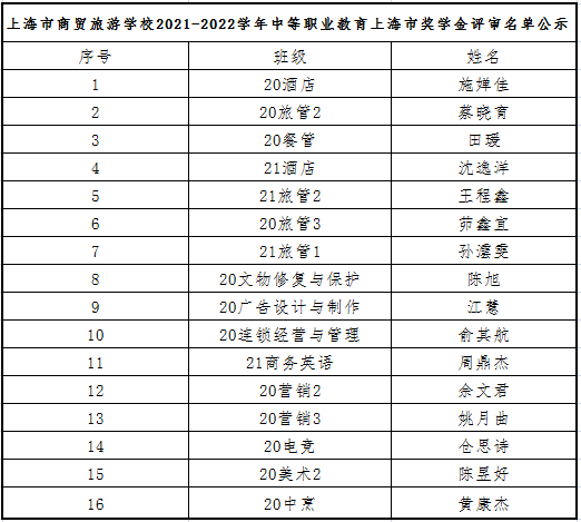 为激励本市中等职业学校学生勤奋学习、努力进取,在德、智、体、美、劳等方面全面发展,根据《上海市教育委员会 上海市财政局 上海市民政局 上海市残疾人联合会关于印发<上海市中小学幼儿园学生资助资金管理实施办法>的通知》(沪教委规〔2022〕8 号)要求, 2022年中等职业教育上海市奖学金评审工作顺利完成, 经学校初评、公示,上海市中等职业教育上海市奖学金评审委员会评审,我校20酒店施婵佳等16位同学获得2022年中等职业教育上海市奖学金,让我们一起来了解身边的榜样吧!
