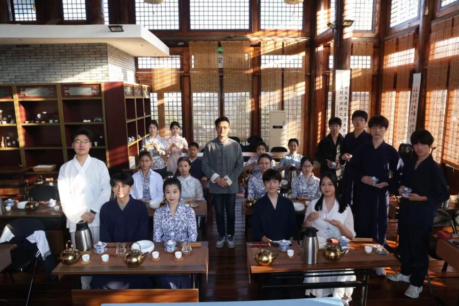 宽敞的茶室中,商旅学子们有条不紊地泡着茶,烫杯、投茶、醒茶、冲泡、出汤、分茶、品茶。伴随着注水声和紫笋茶香,他们惬意享受着这段安静的时光,在与茶的互动中感受着中国传统茶文化的魅力。