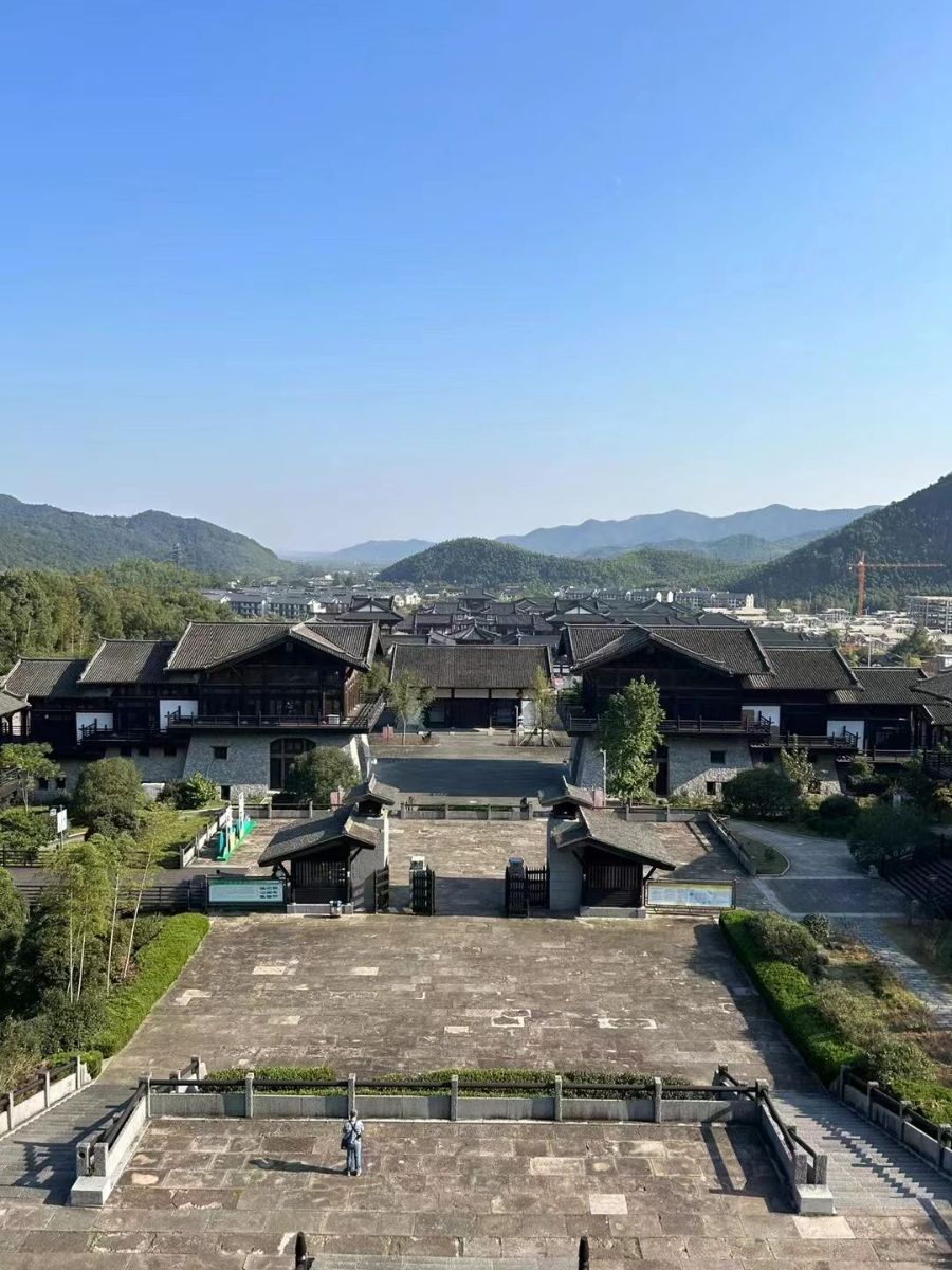 澄澈的天空映射着学子们激动的心情。同学们迫不及待的登上台阶,站定在贡茶院前往后瞧,便能俯瞰整条街道和远处的山脉。整座贡茶院坐落在群山之间,四周围绕着树木和竹林,像是停留在唐代的世外桃源。