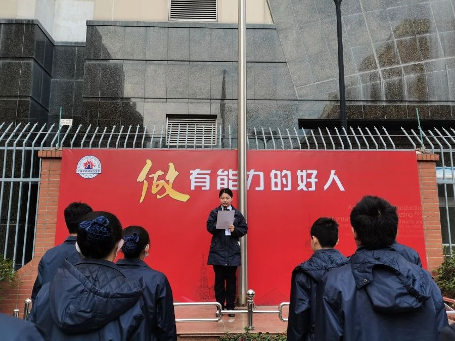晨会课上,浦东浦西校区师生在操场上排着整齐的队伍,举行简单而又庄严的升国旗仪式并进行国旗下演讲。23西烹班的王天祥和21文物2班的张箐楠同学分别进行了主题演讲。