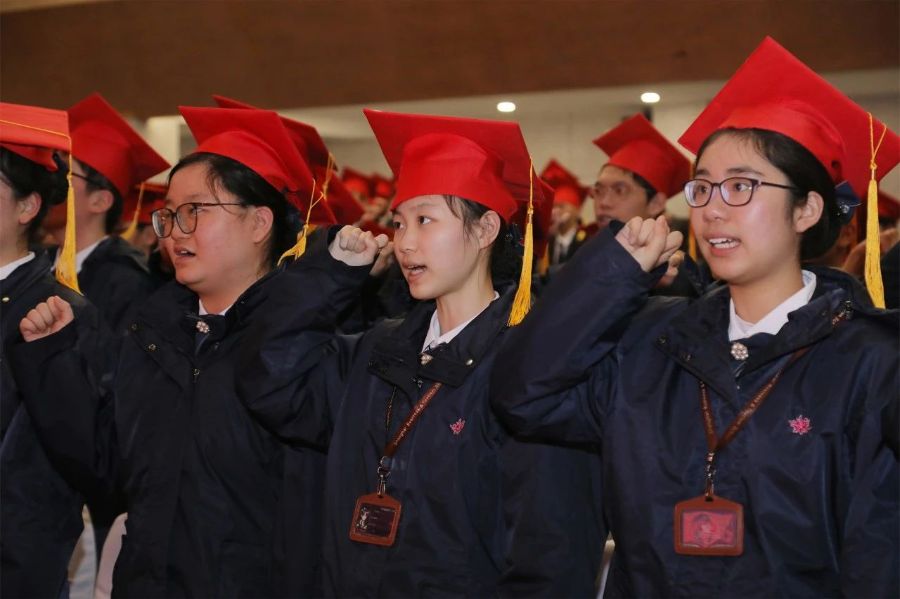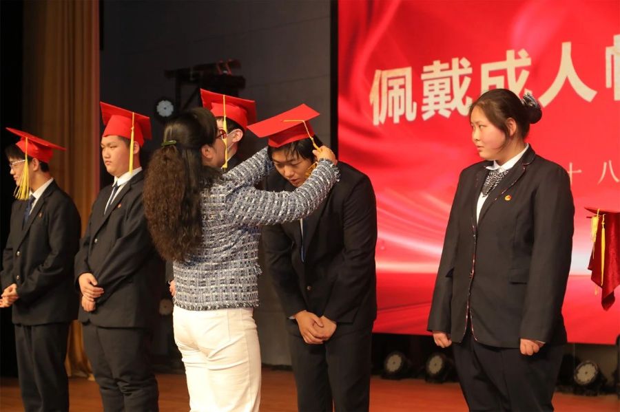 在老师和家长的见证下,冯校长和各班班主任为同学们佩戴成人帽,颁发《中华人民共和国宪法》。在团委学生副书记刘莉带领下,同学们在国旗下郑重宣誓,宣告自己跨入成人行列,并向师长行鞠躬礼,感恩师长的辛勤教诲。