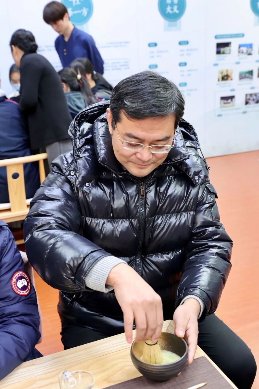 首先,主持人向大家介绍了宋式点茶的历史以及文化,引导同学们认识茶桌上的各类茶粉以及茶具。老师同学们纷纷跃跃欲试,认真学习了点茶的要义。