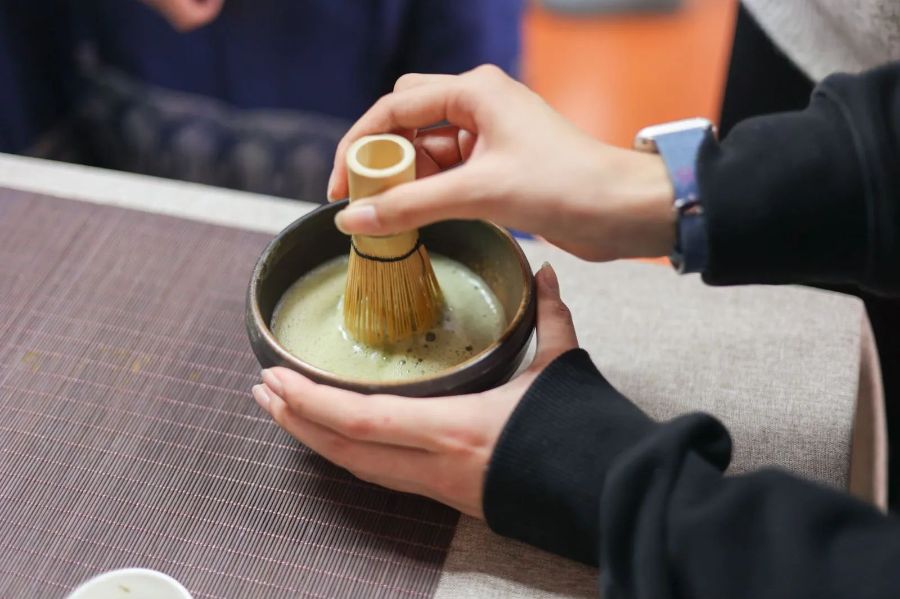 先用热水温茶盏、茶筅。后将抹茶粉倒入碗中,调成膏状,再依次加入适量热水,用茶筅立快速搅动调成糊状,让茶末上浮,形成粥面。