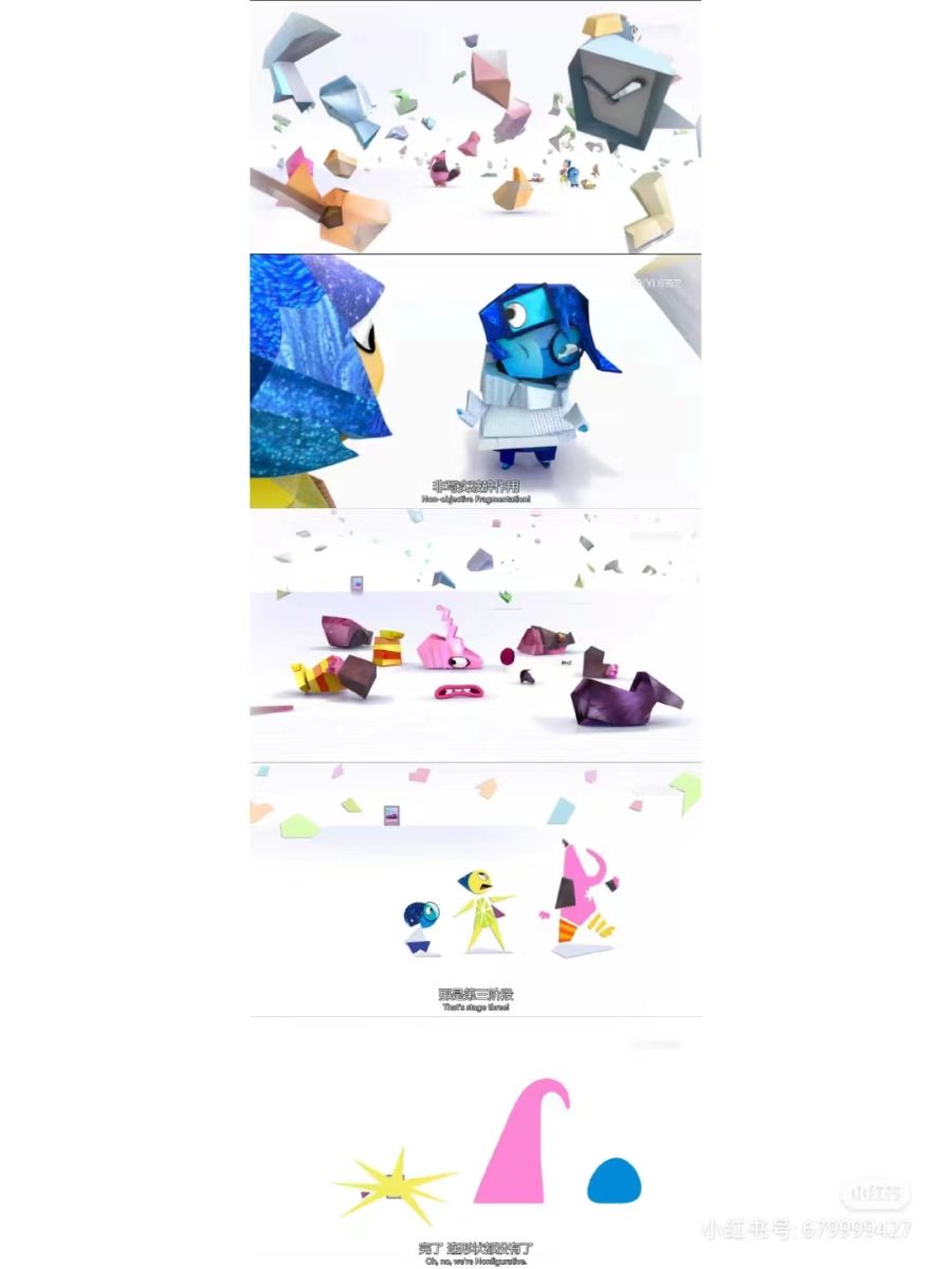 几个画面:乐乐和忧忧被不小心吸进了管道,到了大脑的另一片记忆区,回不到控制中心,这个时候,没有了乐乐,茉莉一直心情非常阴郁,以前建立的一座座小岛(搞笑岛,友情岛,曲棍球岛)全部逐渐坍塌,那个时候我的心情也很难受,很能体会那种感受想不到小任何乐趣的感觉但是乐乐没有放弃,她总是非常乐观,拖着忧忧找回去的路,保护着茉莉的核心记忆,看到乐乐这么的努力,我又很感动,我们的身体里何尝不是也藏着乐乐情绪,她其实一直在为我们努力着,想让我们开心起来,请大家看到她的努力与不懈。