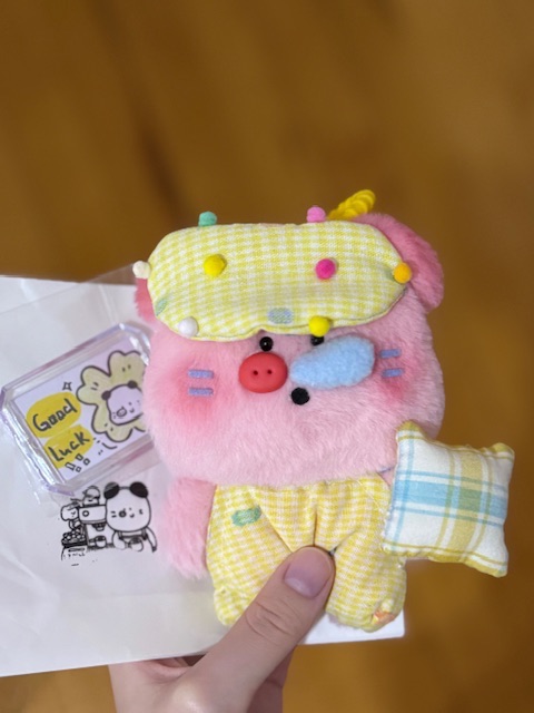 它穿着同款黄白格纹的小睡衣,搭配一个蓝白格纹的小枕头,这一身“居家装扮”把慵懒又可爱的气质拿捏得死死的。旁边还有一张印有“Good Luck”字样和萌趣图案的卡片,仿佛在传递着满满的好运。无论是把它当作钥匙扣挂在包上,还是放在床头当小摆件,都能瞬间为生活增添一抹治愈的可爱色彩,让人忍不住想要把它捧在手心,好好rua上一把。