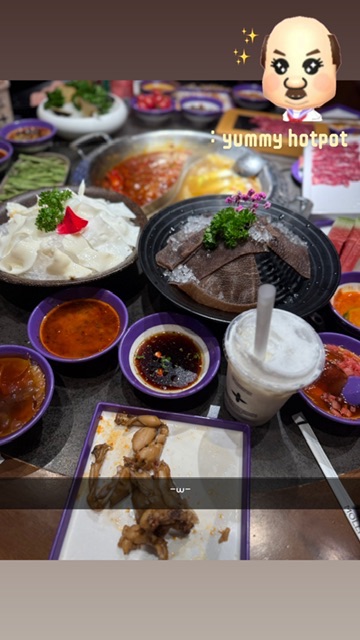 各色蘸料盛在紫色小碗里,红油的、豉油的,每一种都仿佛在召唤着食材的入驻。一杯冰饮更是解腻神器,绵密的泡沫下是清爽的滋味。周围还散落着新鲜的蔬菜、红艳的小番茄,甚至还有西瓜解辣。