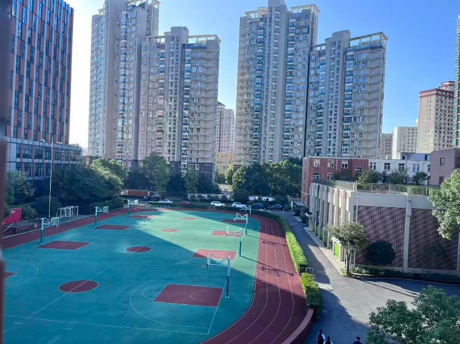 这片被高楼环抱的篮球场,仿佛是城市呼吸的绿肺。翠绿的地面与热烈的红框勾勒出青春的轮廓,奔跑的身影与篮球的节奏是这里永恒的主题。