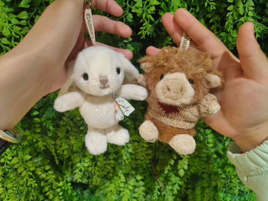 它们的挂绳上都印着“GABRIEL”,这是它们的名字,也是它们的故事。也许它们曾经一起挂在书包上,陪着小主人走过上学的路;也许它们被放在床头,在夜晚的梦里守护着主人。此刻,它们被捧在手心,背景是一片翠绿的植物墙,像是把它们从日常生活中轻轻拔起,放进了一个小小的童话世界里。