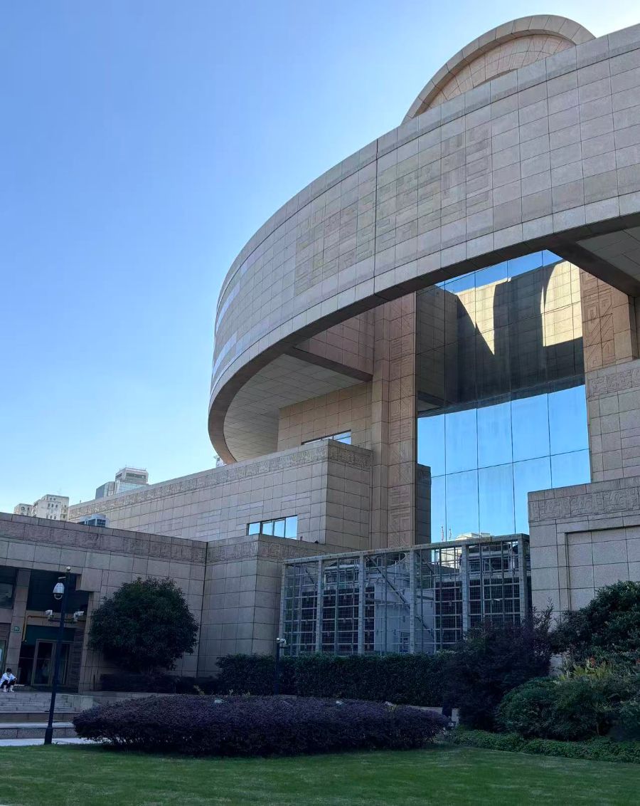 这周跟着老师来上海博物馆附近写生,刚到就被眼前这栋建筑抓住了视线——浅米色的石材墙面带着细密的纹理,中间一大块玻璃幕墙像面镜子,把蓝天和旁边的楼都装了进去,圆弧形的屋顶顶上还有个半圆的镂空,看着特别大气。