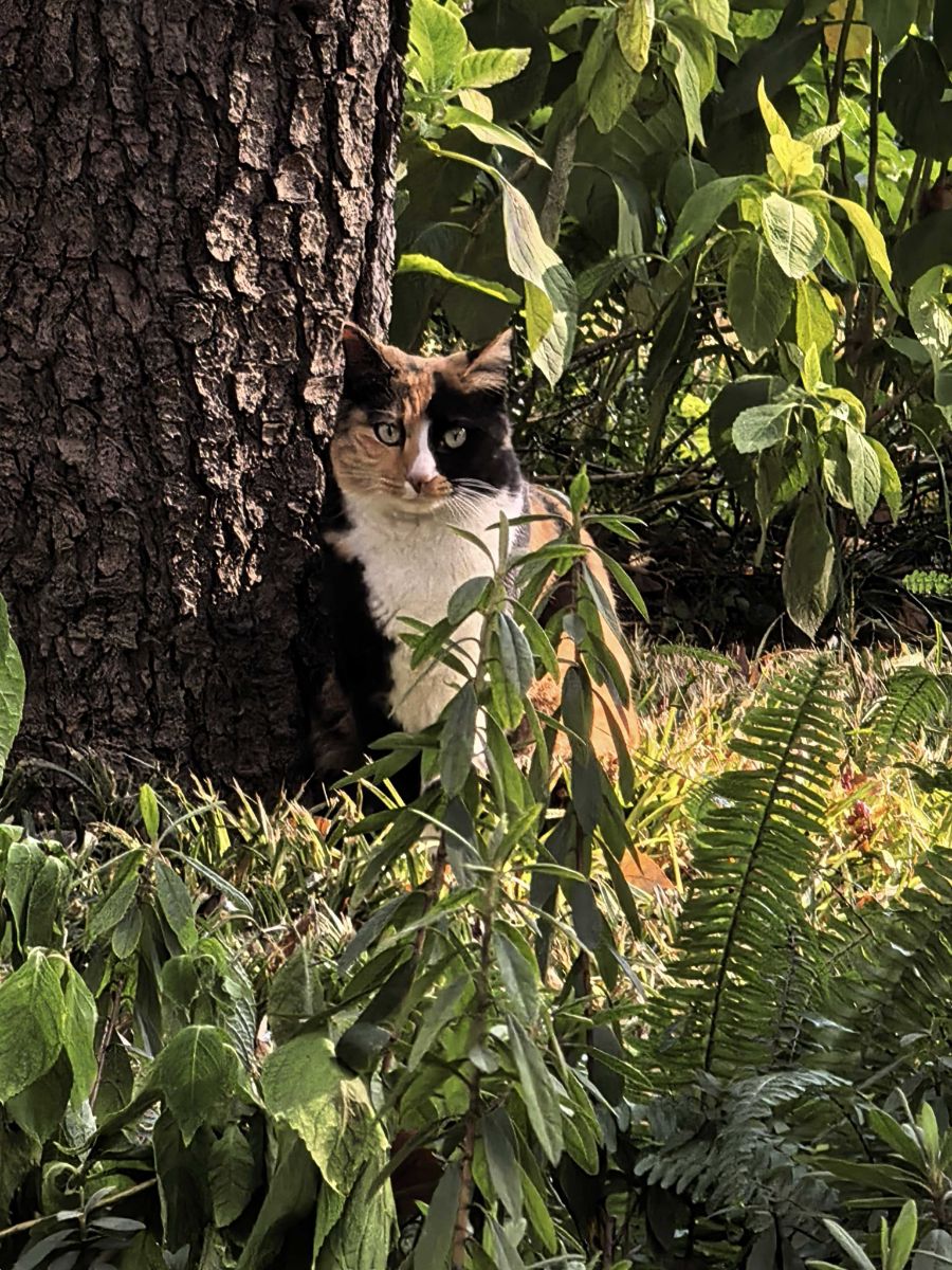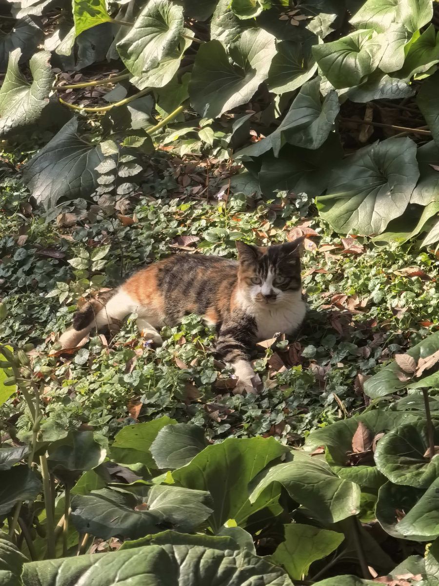 而三花猫则偏爱玩“躲猫猫”的游戏。一只倚着粗壮的树干,被层层绿植半掩着,眼睛在光影里忽明忽暗,慢慢从草丛里探身出来,尾巴高高竖起,小心翼翼地踩着青草往前走,专注的模样像是发现了什么有趣的小猎物;另一只藏在金黄的野花与宽大的绿叶间,只露出半张脸,眼神里透着几分狡黠,后又舒展身体趴在草地上,任由阳光洒在三色皮毛上,懒洋洋地眯着眼睛,仿佛把周遭的热闹都隔绝在外。