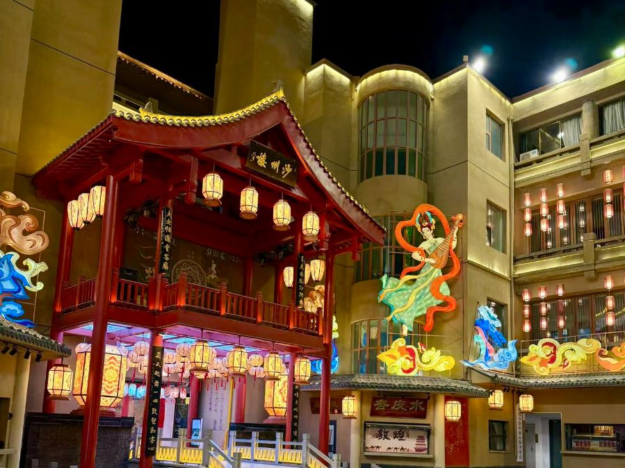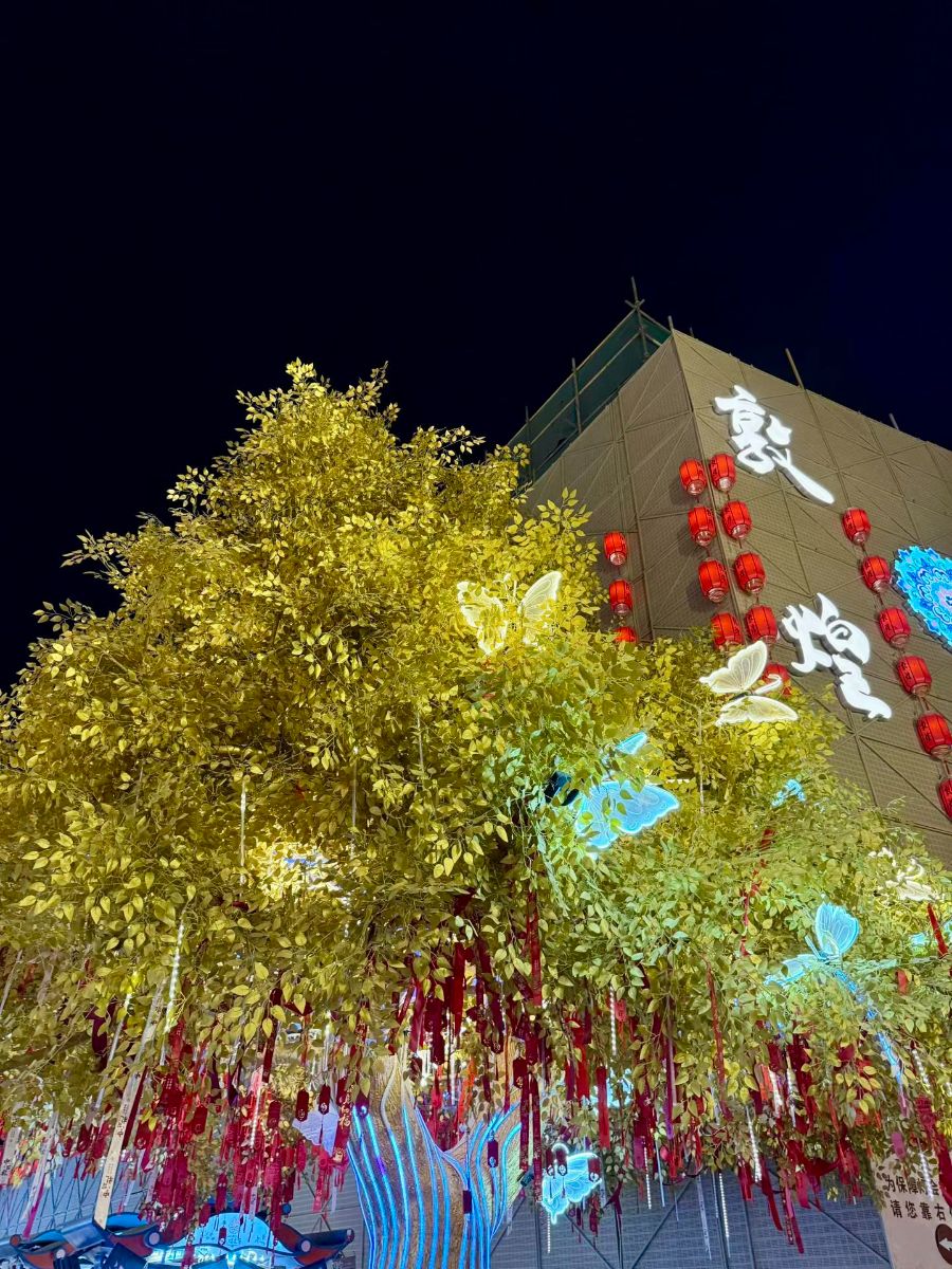 夜晚的敦煌同样精彩。敦煌夜市灯火璀璨,金色的牌坊上绘着精美的飞天图案,红灯笼高高挂起,整条街热闹非凡。街边的许愿树挂满了红丝带,在灯光下格外好看,充满了温馨的氛围。漫步在夜市中,既能感受浓郁的烟火气息,又能体会到敦煌独特的古韵风情。
