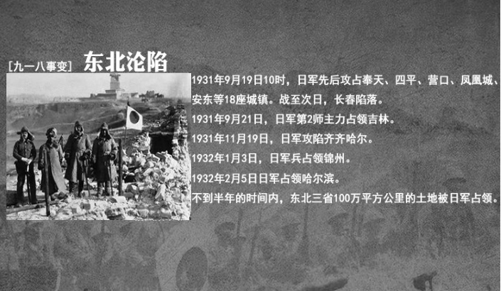 1931年9月18日夜,在日本关东军安排下,铁道“守备队”炸毁沈阳柳条湖附近日本修筑的南满铁路路轨,并栽赃嫁祸于中国军队。日军以此为借口,炮轰沈阳北大营,是为“九一八事变”。次日,日军侵占沈阳,又陆续侵占了东北三省。1932年2月,东北全境沦陷。此后,日本在中国东北建立了伪满洲国傀儡政权,开始了对东北人民长达14年之久的奴役和殖民统治。