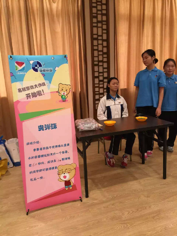 台上激烈平涂的同时,台下也展开了丰富多彩的活动:易班熊拼图,夹弹珠,吹乒乓球等小游戏同学们玩的不亦乐乎。每一个游戏站点都围着一群等待参与的同学们,离场时,几乎每一位同学手上都拿着奖品,满载而归!