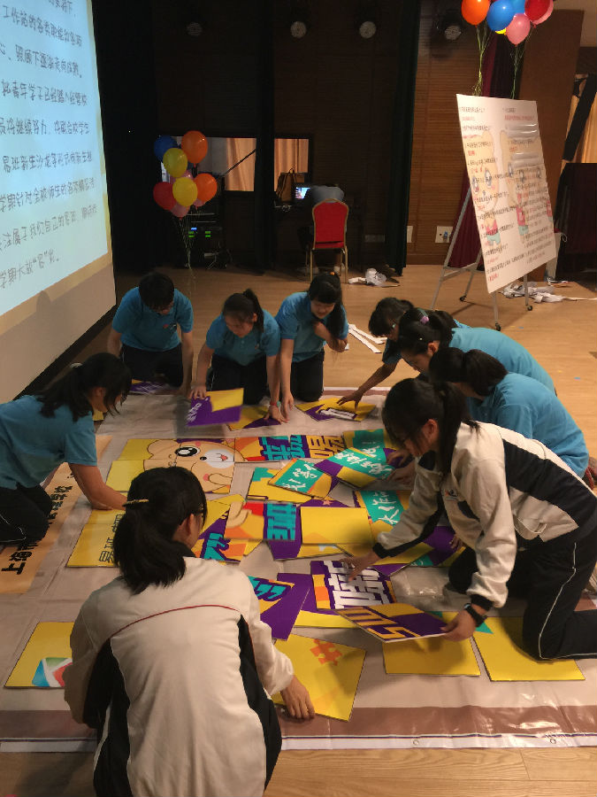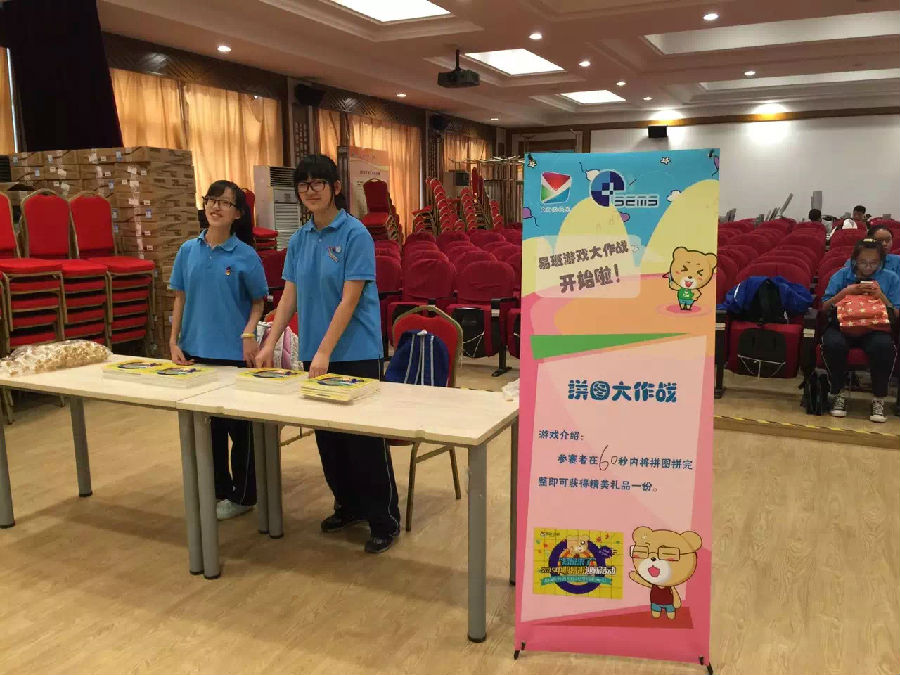 在问答环节结束后,本次游园活动的最高潮部分终于到来了!10位同学组成小组上台拼图,由工作人员进行计时,最终成绩将其他学校进行比拼。在同学们的共同努力下,我校本次易班熊拼图战的成绩是:3′01″,暂列校际第一名!