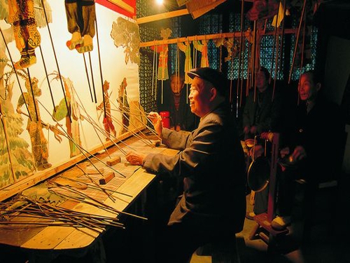 皮影戏又名“灯影戏”、 “土影戏”。最先传于河北、陕西等地,表演者操纵的皮质人形,即皮影,是用羊皮或驴皮制作的。通过灯光照射,在幕上映出皮影人的影像。皮影的造型各异、风格多变,曲目也很多。